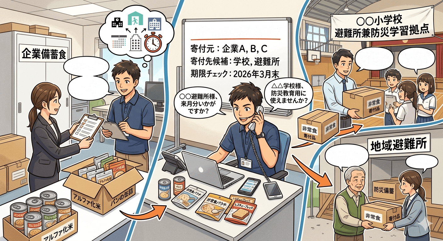 期限が近づいた備蓄食を有効活用しようとしても、「寄付先を探す手間」「受入れの条件や調整の難しさ」「活用先の情報不足」などのハードルがあり、実施には相応の負担が伴います。