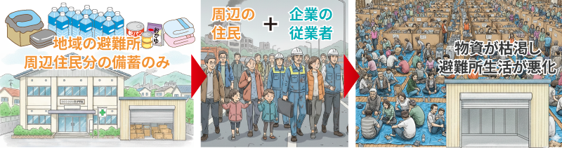 「いざとなったら避難所へ」という考えは、企業にとって大きなリスクを伴います。自治体の備蓄物資は住民分を確保するのが精一杯であり、企業がそこに頼ることは現実的ではありません。