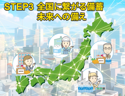 私たちは災害時に企業備蓄の不足リスクを回避する、企業間専用の調達ネットワーク【災害備蓄品シェア・ネットワーク】を構築しています。