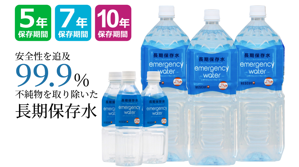 飲料用、お薬の服用、備蓄食の調理、手洗い、洗浄、ペットの飲水など、断水時でも様々な用途で水は必要です。長期保存水は、携帯に便利な【500ml】と収納時の省スペース化を考慮した【2L】のペットボトルをそれぞれ『5年保存』『7年保存』『10年保存』の3タイプずつご用意しました。それぞれの用途に合わせてお選びください。